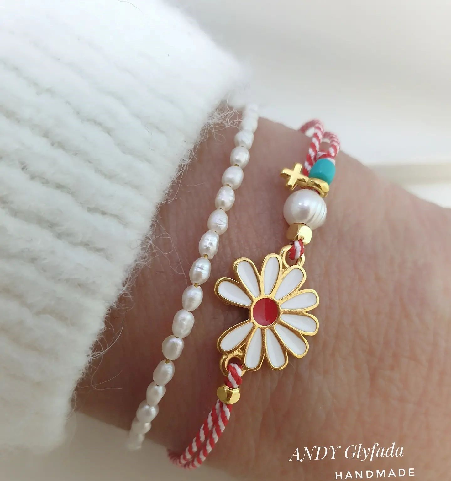 Χειροποίητο Βραχιόλι Μαρτάκι Μαργαρίτα με Σμάλτο -Μαργαριτάρι και Τιρκουάζ Πέτρα σε Βαμβακερό Κορδόνι Μακραμέ